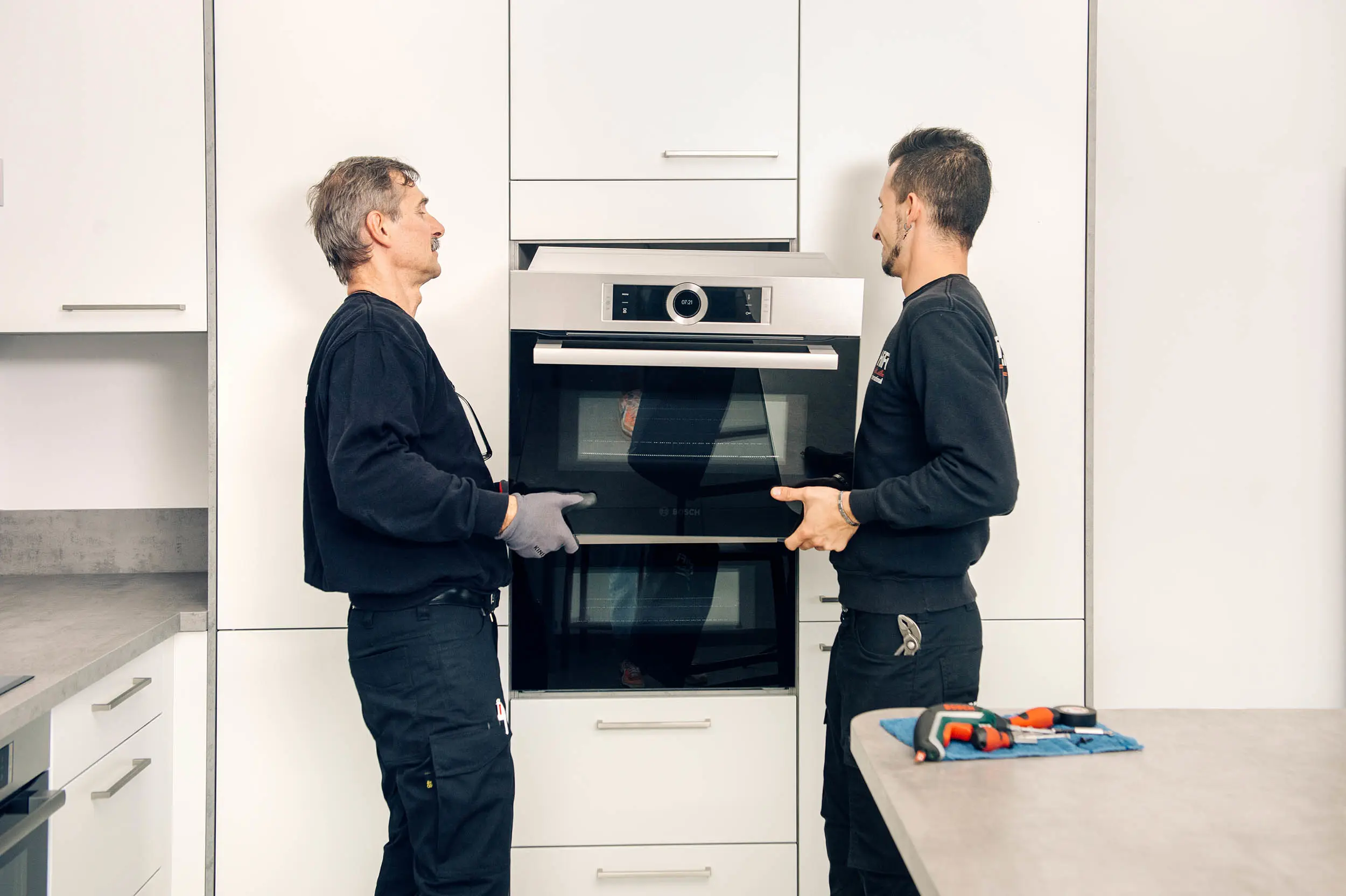 Available for all built-in appliances: oven, cooktop, dishwasher, refrigerator, double-door refrigerator, and hood (excluding island hoods). Note that installing door panels on the new appliance is not included in this service.